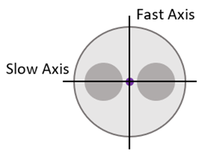 保偏光纖的應力棒可對纖芯施加應力并在一個軸上產生更大的折射率,該軸稱為慢軸,因為折射率較大時,傳輸速度較慢,如圖1。