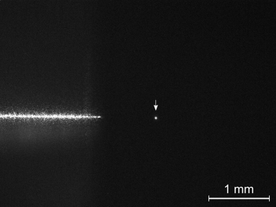 圖為真空中用Koheras BOOSTIK C15發(fā)出的激光束捕獲的懸浮納米球(白色箭頭位置)。壓力低于1×10-6 mbar。
