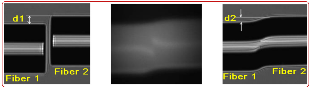 圖2▲從左至右:電弧放電前、電弧放電、電弧放電后。偏移熔接法放電功率校準(zhǔn),光纖1和光纖2是相同的光纖類型,通過(guò)測(cè)量光纖軸上d1-d2偏移變化量,該方法僅適用于直徑為125um的通信光纖。
