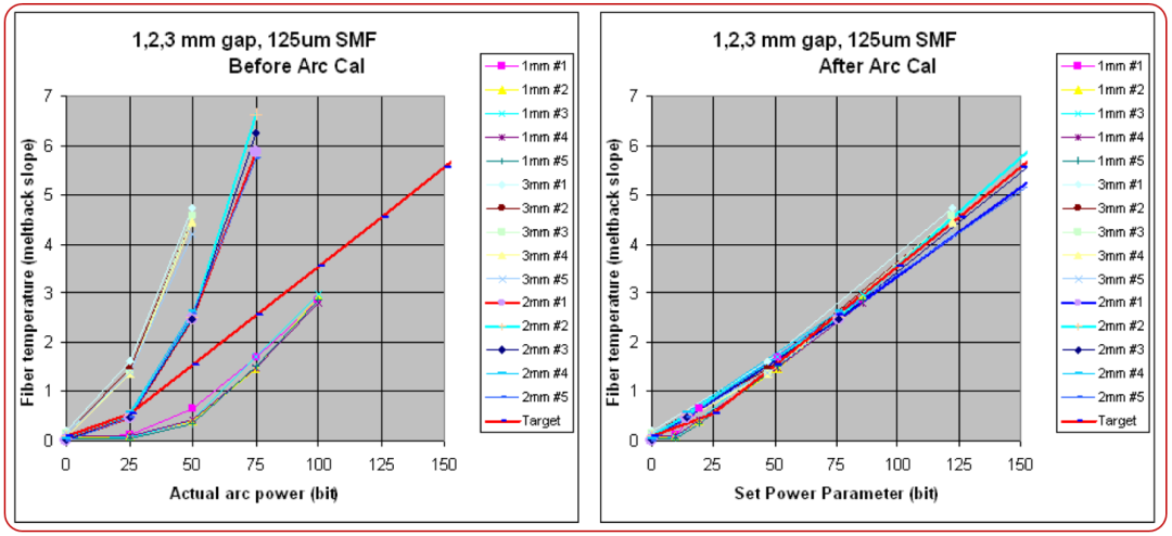 從圖6所示的示例中,可以看到使用前面描述的新放電校準(zhǔn)方法,125、220和400um光纖可以在不同的電弧大小設(shè)置下用相同的電弧功率設(shè)置進(jìn)行熔接。換句話說(shuō),在不同光纖類型和電弧大小設(shè)置(電極間隔)條件下,操作人員可以很容易的得到所需的熔接結(jié)果,對(duì)于任何新型或未知類型的光纖,工程師可以輕松的使用相同的功率設(shè)置調(diào)整熔接參數(shù),無(wú)需繁瑣地尋找合適的放電功率。