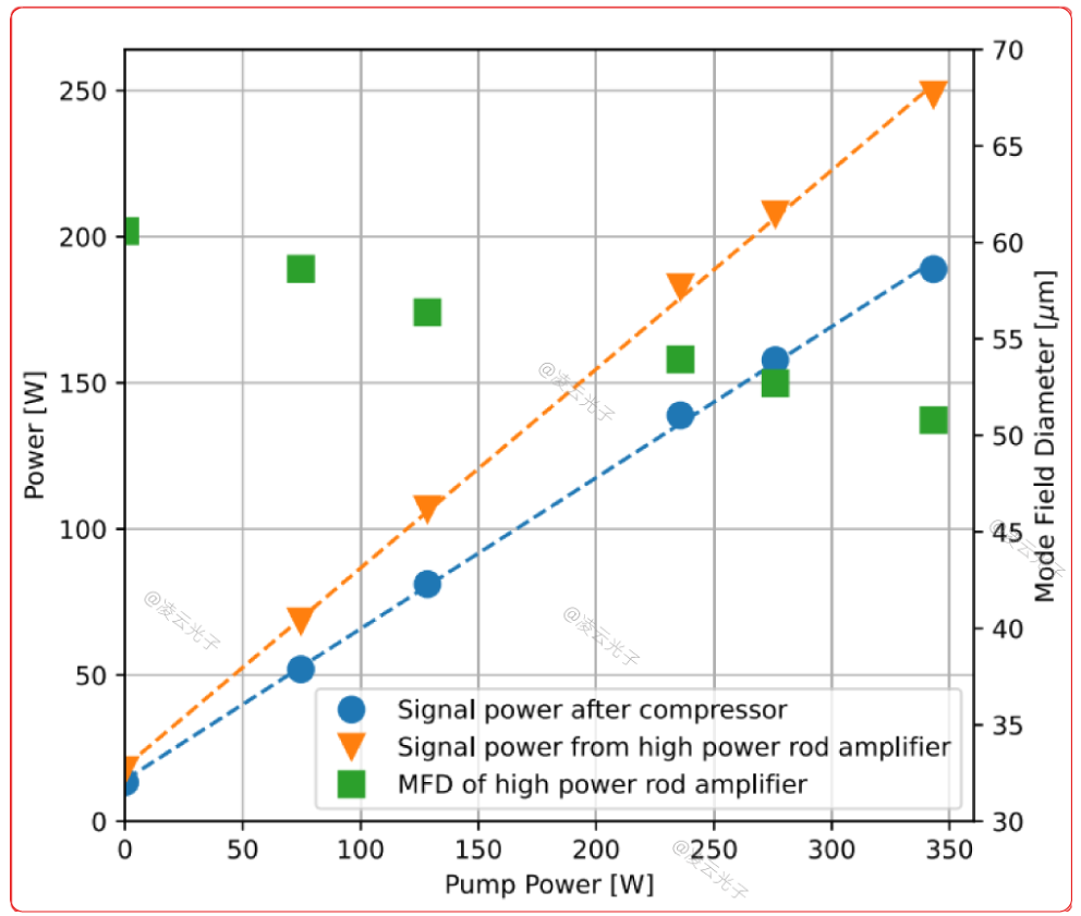圖2顯示了經(jīng)過壓縮后測量的平均信號功率,以及Amp5輸出的信號光的模場直徑MFD,隨泵浦功率變化的函數(shù),壓縮前后斜效率為0.68和0.52。由于aeroGAIN-ROD是一種大芯單模光纖,數(shù)值孔徑相應(yīng)較小,這反過來又使NA容易受到熱致折射率變化的影響,對于二氧化硅來說,變化約為≈1 × 10?5K?1[15]。隨著信號功率從0增加到248W,由于熱透鏡效應(yīng)導致的纖芯發(fā)熱,使得光纖的模場直徑MFD,從60μm變化到50μm。