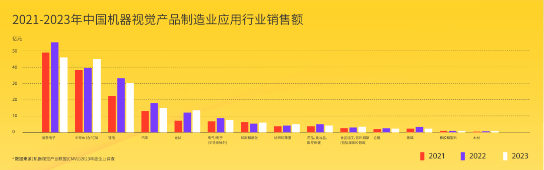 2023年,機器視覺下游應用行業(yè)中,電子信息、印刷、醫(yī)藥、玻璃等行業(yè)規(guī)模下降,影響對機器視覺產品的需求增長;食品、煙草行業(yè)規(guī)模增速放緩,對機器視覺產品的需求增長也有一定影響。另一方面,下游行業(yè)中,汽車、鋰電、郵政業(yè)恢復增長,對機器視覺產品需求增速提升。中國機器視覺市場銷售額整體增長10.7%,增速較2022年回落6.4個百分點。