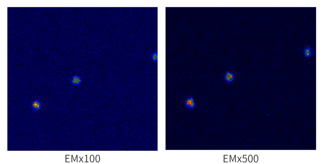 EMCCD對(duì)信號(hào)進(jìn)行數(shù)千倍的增益,原本難以與讀出噪聲區(qū)分開(kāi)的微弱信號(hào)能夠被放大到高于讀出噪聲,由于信號(hào)增益發(fā)生在讀出之前,實(shí)際上降低了相機(jī)的讀出噪聲水平,減少讀出噪聲對(duì)信號(hào)的影響,實(shí)現(xiàn)單光子級(jí)的靈敏度。即使在相對(duì)較低的EM增益設(shè)置下,有效讀出噪聲也能降低到小于1個(gè)電子(RMS)。