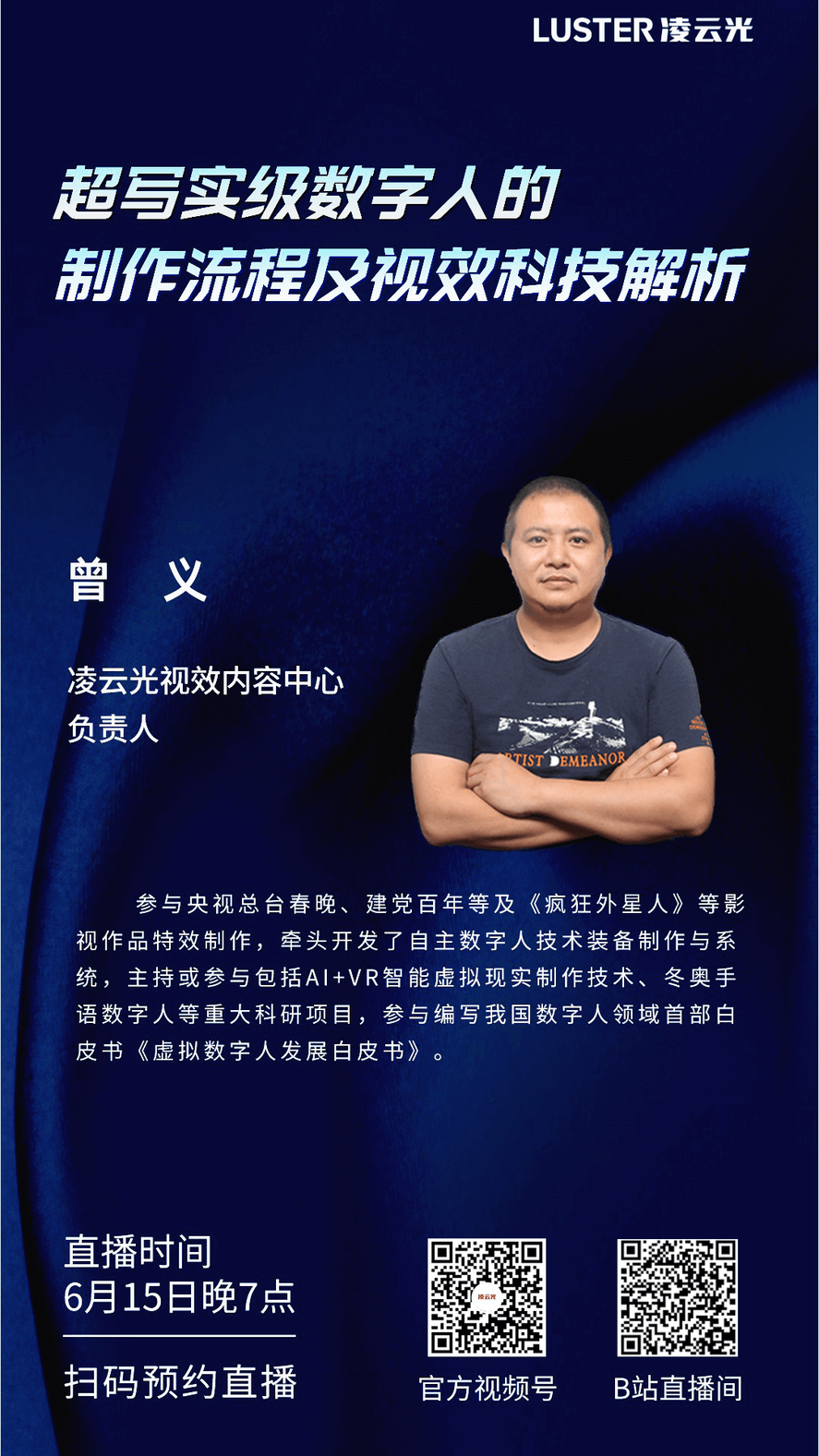 6月15日晚7點,由凌云光重明視效工作室負責人曾義帶來直播分享,將圍繞《超寫實級數(shù)字人的制作流程及視效科技解析》,從超寫實級數(shù)字人內容創(chuàng)作需求及難點、制作流程、視效科技和影視級應用案例等方面進行分享。