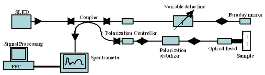 下圖是一個典型的SD-OCT系統(tǒng)圖,基于測量臂與參考臂的干涉光譜與樣品不同深度的背向散射光強(qiáng)度信息恰好是一對傅里葉變換對的關(guān)系這一原理,SD-OCT避免了在測量時需要改變參考臂光程長度的問題,而是將代表著樣品不同深度信息的光束統(tǒng)一收集后,通過傅里葉逆變換即可解算出樣品深度的強(qiáng)度信息,實(shí)現(xiàn)了樣品軸向信息的并行獲取,從而省卻了軸向掃描。