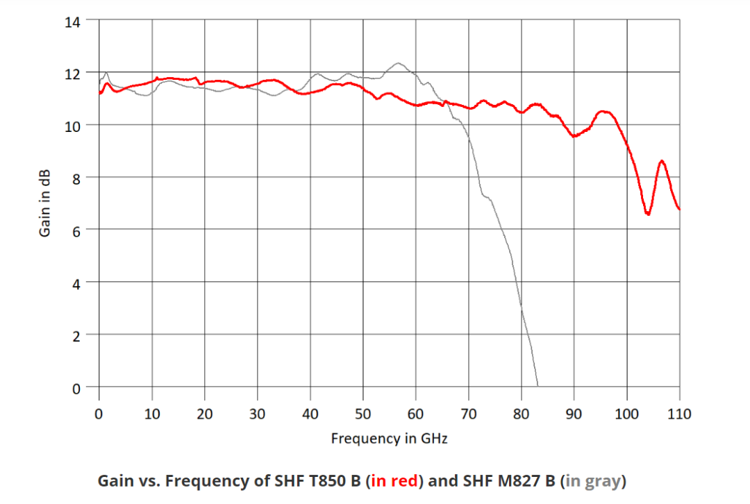 為了解決這個難題,SHF將于2023 OFC正式推出新款劃時代產(chǎn)品——100GHz超寬帶線性放大器SHF T850B ,其可提供3dB帶寬從<100kHz到>100GHz的超帶寬放大性能,可全面支持100GBaud下NRZ以及PAM4信號的放大需求。其帶寬性能較上一代70GHz 放大器 SHF M827 B提升40%以上。其S21對比測試圖如下: