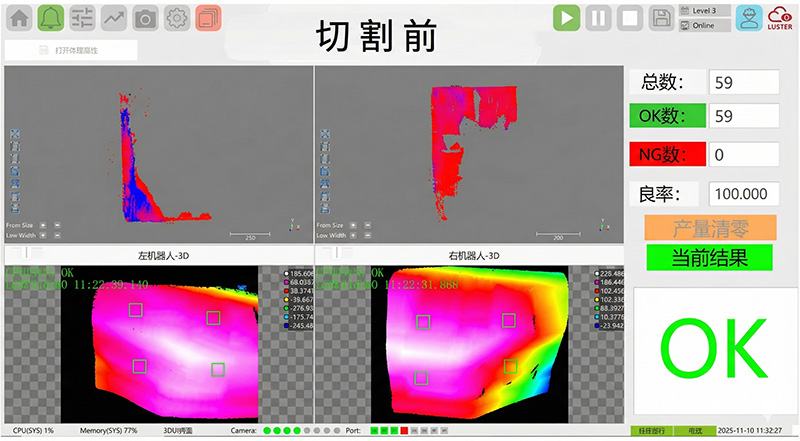 凌云光推出熱成型切割視覺檢測(cè)方案,采用雙6軸機(jī)械臂搭載定制2D+3D成像模組,以“視覺+AI+自動(dòng)化”協(xié)同技術(shù),實(shí)現(xiàn)70余種零件切割前后的全流程高精檢測(cè)。切割前,檢測(cè)放置偏位與浮高翹曲,防止激光頭撞機(jī);切割后,實(shí)時(shí)檢出未切透、漏切、孔位偏差等缺陷,杜絕批量問題流出。方案支持固定工位與隨線在線全檢兩種部署方式,已成功應(yīng)用于國(guó)內(nèi)頭部汽車廠商多車型混線生產(chǎn)。