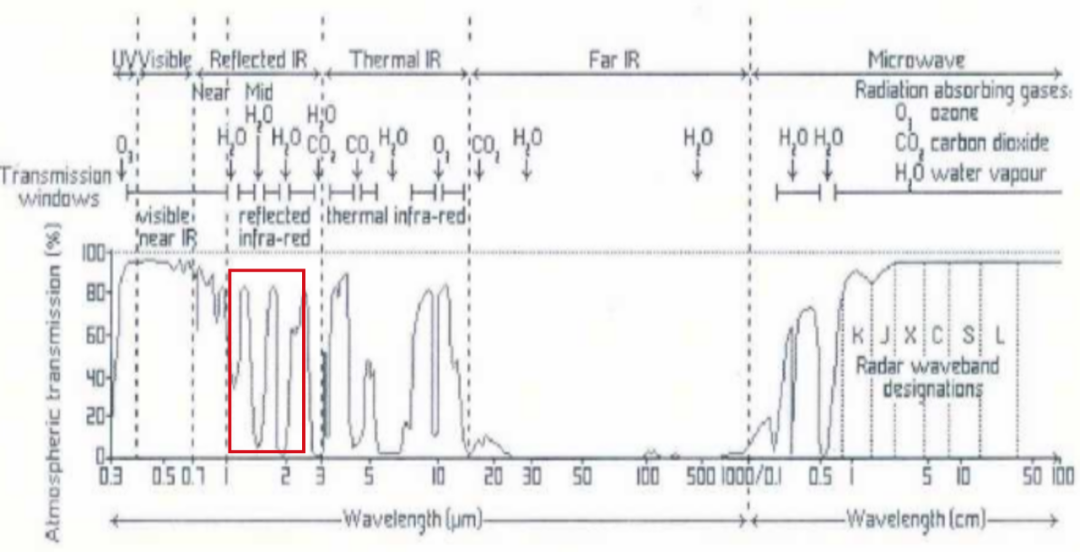 紅外輻射吸收較弱,透過率較高的區(qū)域,也被稱為“大氣窗口”。從下圖中可以看到,在1.17~2.31um存在J,H,K三個(gè)近紅外大氣窗口,或是在地面大氣窗口2.5~5um波段。