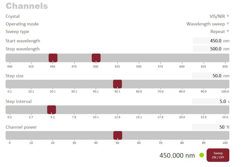 值得注意的是,在軟件設(shè)置選項(xiàng)中輸出晶體的RF功率模式都要選擇Normal模式,圖11所示,這個(gè)模式已經(jīng)在NKT工廠進(jìn)行了上述射頻功率曲線矯正優(yōu)化,除非要交換某些硬件,否則不需要進(jìn)一步優(yōu)化。只有當(dāng)一個(gè)新的AOTF晶體或新的外部RF驅(qū)動(dòng)器被添加到SELECT時(shí),才使用Overdrive模式。在這些情況下,在工廠設(shè)置的最佳射頻功率校準(zhǔn)曲線不再有效,可能需要進(jìn)行新的校準(zhǔn)。