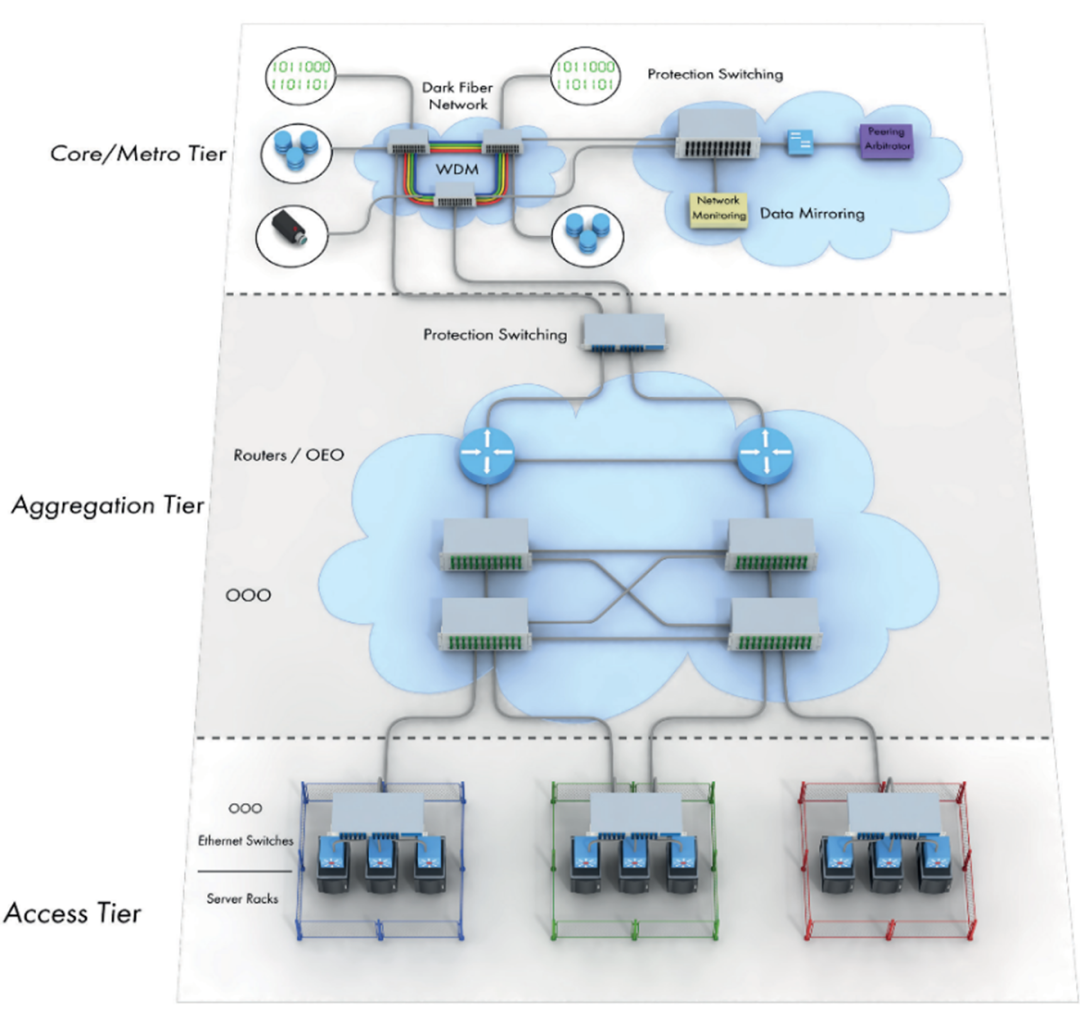 ????在當(dāng)今的三層數(shù)據(jù)中心網(wǎng)絡(luò)架構(gòu)中,支持SDN的全光交換被引入到多個層級,以優(yōu)化數(shù)據(jù)中心的網(wǎng)絡(luò)資源,以及現(xiàn)有的分組路由器和交換機(jī)。全光交換不能替代分組交換和路由,它被加入到現(xiàn)有網(wǎng)絡(luò)中,以提供關(guān)鍵擁塞點(diǎn)所需的容量、靈活性和可擴(kuò)展性,滿足繁重且持續(xù)的流量需求。大型數(shù)據(jù)中心擁有分布在房間、建筑物和園區(qū)中的數(shù)萬臺服務(wù)器集群,為了在所有服務(wù)器之間提供可靠和可擴(kuò)展的互連,數(shù)據(jù)中心網(wǎng)絡(luò)通常在核心/城域、匯聚和接入層使用分組路由器和電路交換機(jī)的組合分層構(gòu)建。這種層次結(jié)構(gòu)實(shí)現(xiàn)了數(shù)據(jù)的高效共享,和跨服務(wù)器群提供服務(wù),同時還連接到外部網(wǎng)絡(luò)。圖1顯示了基本的分層方法,包括每層中全光交換的潛在位置。