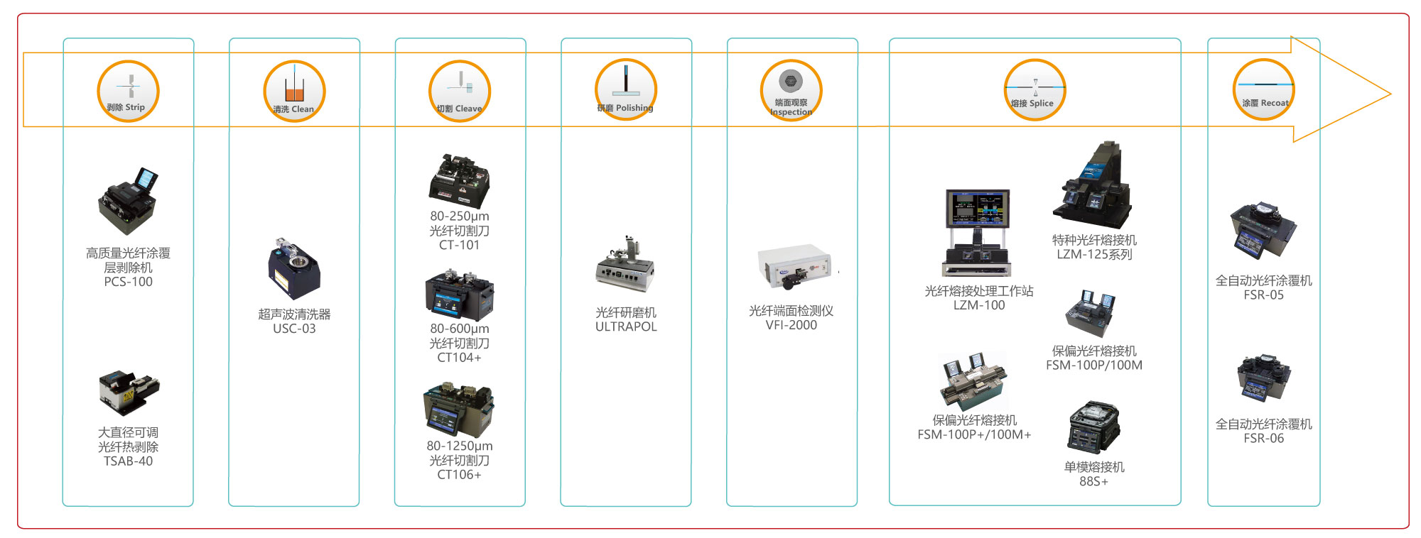 隨著在工業(yè)及科研領(lǐng)域應(yīng)用的不斷擴(kuò)展,光纖激光技術(shù)向著更高功率、更高平均功率及能量、更短脈沖周期以及更高亮度的方向發(fā)展,這便對(duì)光纖處理技術(shù)與工藝、光纖器件的品質(zhì)提出了更高的要求。凌云光提出的光纖處理一體化解決方案包括:剝除—清洗—切割—檢測(cè)—研磨—熔接—涂覆,每個(gè)步驟匹配相應(yīng)的近乎自動(dòng)化的光纖處理設(shè)備,為客戶獲得高品質(zhì)標(biāo)準(zhǔn)化的工業(yè)級(jí)效果。同時(shí)特種光纖處理設(shè)備,還為客戶提供了制作泵浦合束器、輸出端帽等高功率器件的專屬平臺(tái),助力客戶完成關(guān)鍵器件的自主生產(chǎn)。