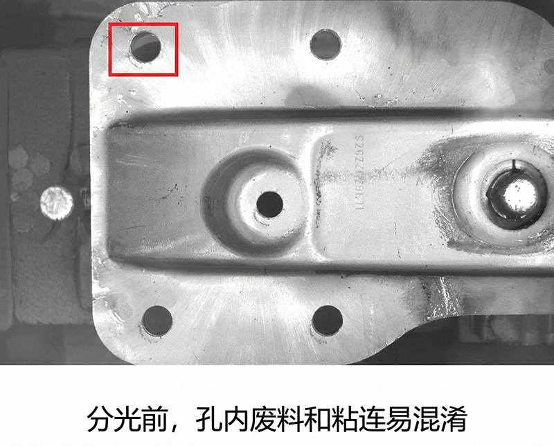 工件(吸能盒、加強(qiáng)板)表面高反光,傳統(tǒng)成像易造成過曝和陰影干擾導(dǎo)致誤報(bào)(如孔內(nèi)廢料和切割粘連易混淆)。方案特別定制四分區(qū)AOI光源實(shí)現(xiàn)均勻照明,精準(zhǔn)檢測(cè)圓孔、方孔、異形孔、裙邊尺寸、主副孔位置關(guān)系等,精度達(dá)0.1mm,顯著降低過檢報(bào)錯(cuò)與批量質(zhì)量風(fēng)險(xiǎn)。